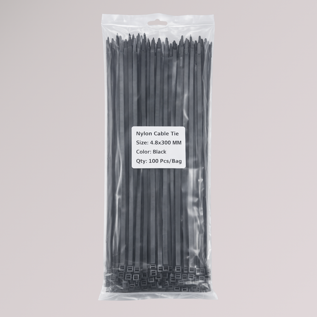 Single Side Cable Ties (Zip Ties) — 4.8 mm × 300 mm (0.19″ × 12″), UV-Resistant, Black, 100 Pack