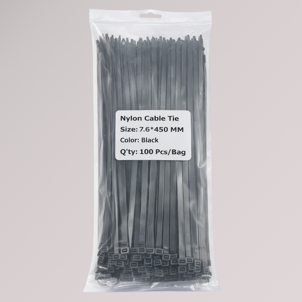 Thick Cable Ties (Zip Ties) — 7.6 mm × 450 mm (0.30″ × 18″), UV-Resistant, Black, 100 Pack